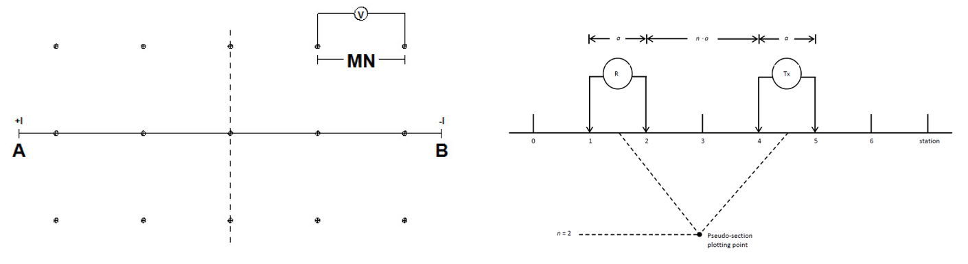 Gradient electrode arrays were applied for the main IP coverage completed across the three targets. In this configuration, the current electrodes are in a fixed position whilst the survey is carried out in the central third of central half along the AB axis and half or two-thirds perpendicular to the AB axis. This electrode array has good lateral resolution, and for the given geological setting, the penetration depth (“PD”) mainly depends on the AB length.