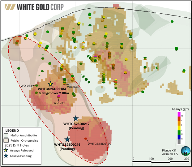 Phase II of the 2025 exploration season has been strategically focused on advancing and expanding the Company’s flagship White Gold Project, following a renewed emphasis on resource growth opportunities within and adjacent to the existing deposits. The program’s first drill hole at the Golden Saddle deposit successfully intersected the targeted high-grade footwall breccia, returning 6.89 g/t Au over 2.8 meters, alongside a very strong interval of 6.89 g/t Au over 50.2 meters within the Main Zone — representing one of the best grade-thickness intercepts ever reported from the property. Mineralization was also confirmed in the hanging wall, underscoring the potential for additional ounces in domains historically not recognized for their accretive resource potential.